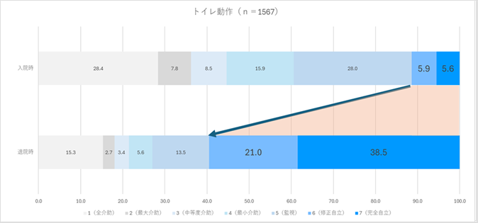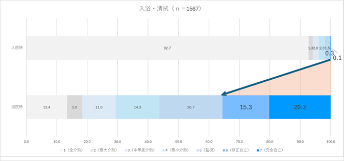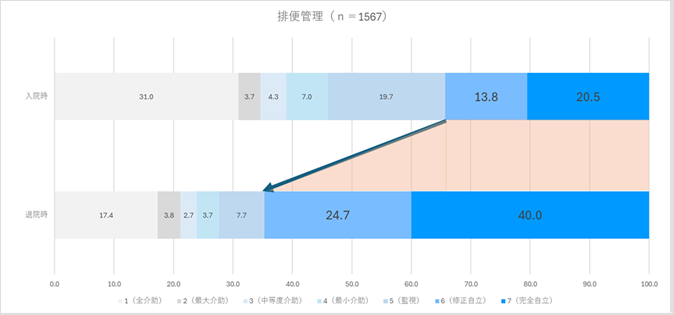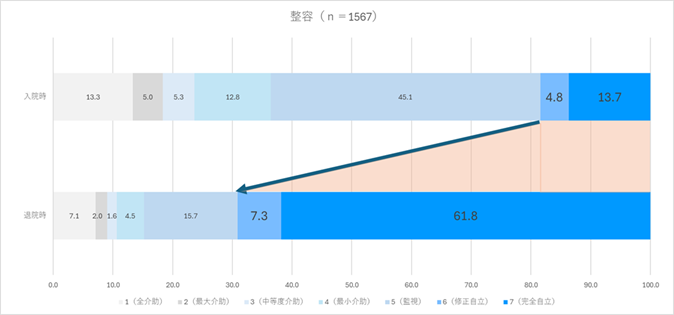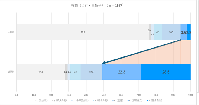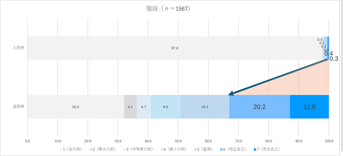 入院時と比較して、退院時には6点・7点(自立または修正自立)の割合が増加しており、